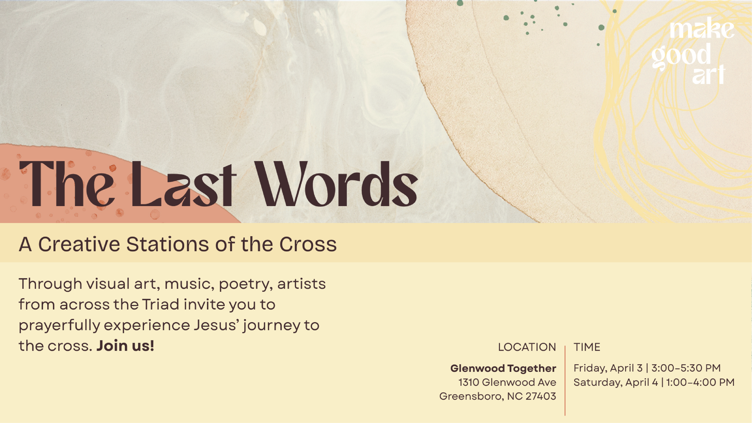 Through visual art, music and poetry, artists from across the Triad invite you to prayerfully experience Jesus’ journey to the cross - please join us! It will be open Friday, April 3rd from 3-5:30pm and Saturday, April 4 from 1-4pm at Glenwood Together - 1310 Glenwood Ave.